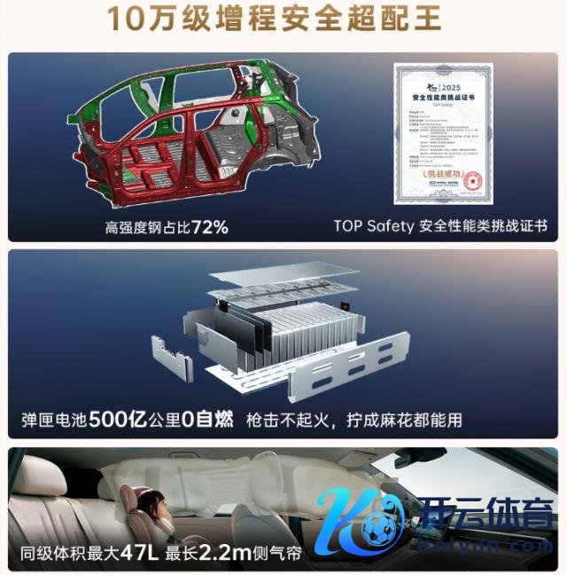 整车车身 72% 高强度钢 + 1500MPa 热成型钢,配备 47L 最长 2 米的大容量侧气帘,能给到的皆给到位。