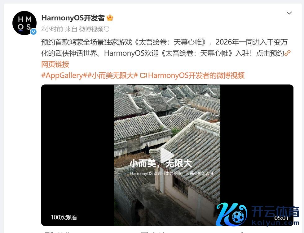 HarmonyOS开发者 官方微博文告,首款鸿蒙全场景独家游戏《太吾绘卷:天幕心帷》已开启预约,将于2026年致密上线,为玩家带来深度和会鸿蒙特质的武侠外传体验。