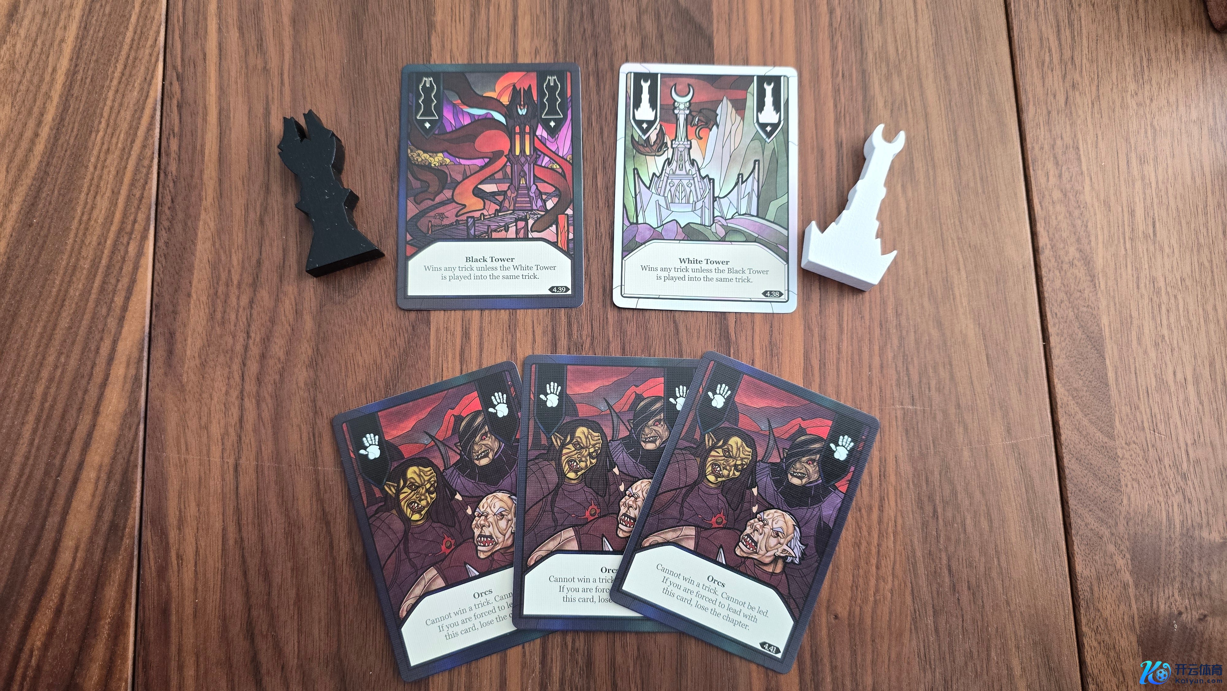 “白塔”和“黑塔”牌亦然新加入的,每张牌在打出时老是能赢下该墩,但若是在并吞墩中同期打出,它们会相互对消。白塔牌还取代了前作中的“至尊魔戒”,持到这张牌的东谈主将饰演阿拉贡并成为第一手的领打者。